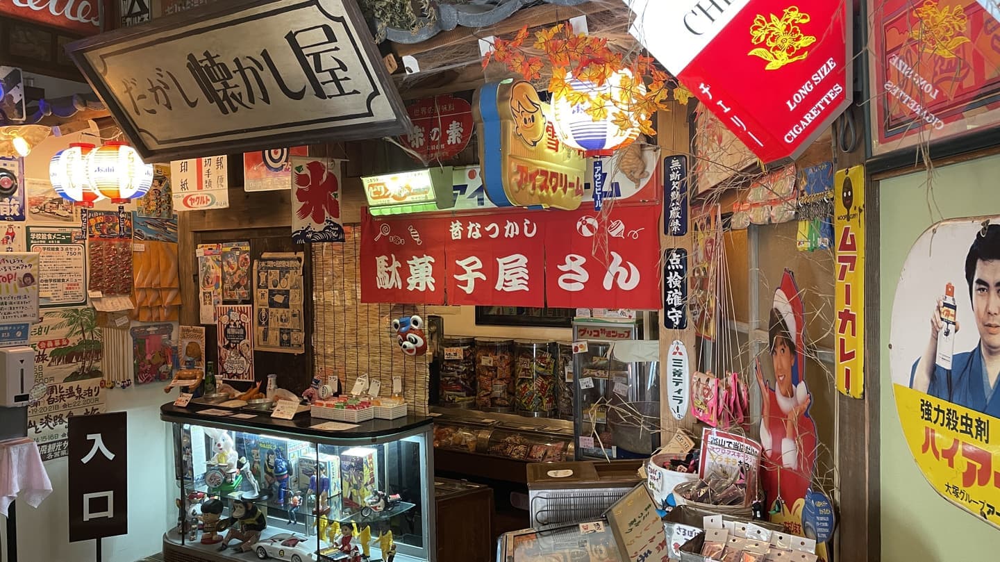 店内では飛騨地域最大級の話題のニューレトロ雑貨やアデリアレトロなどのレトロ雑貨を販売しております。お子様には昔ながらの価格で昭和の駄菓子や瓶ドリンクなども。表には糖度40度の40日間熟成させた九州産の紅はるかの焼き芋を自動販売機で販売しています。熱い焼き芋と冷たい焼き芋は、まるでスイーツのよう。入館料は無料です。