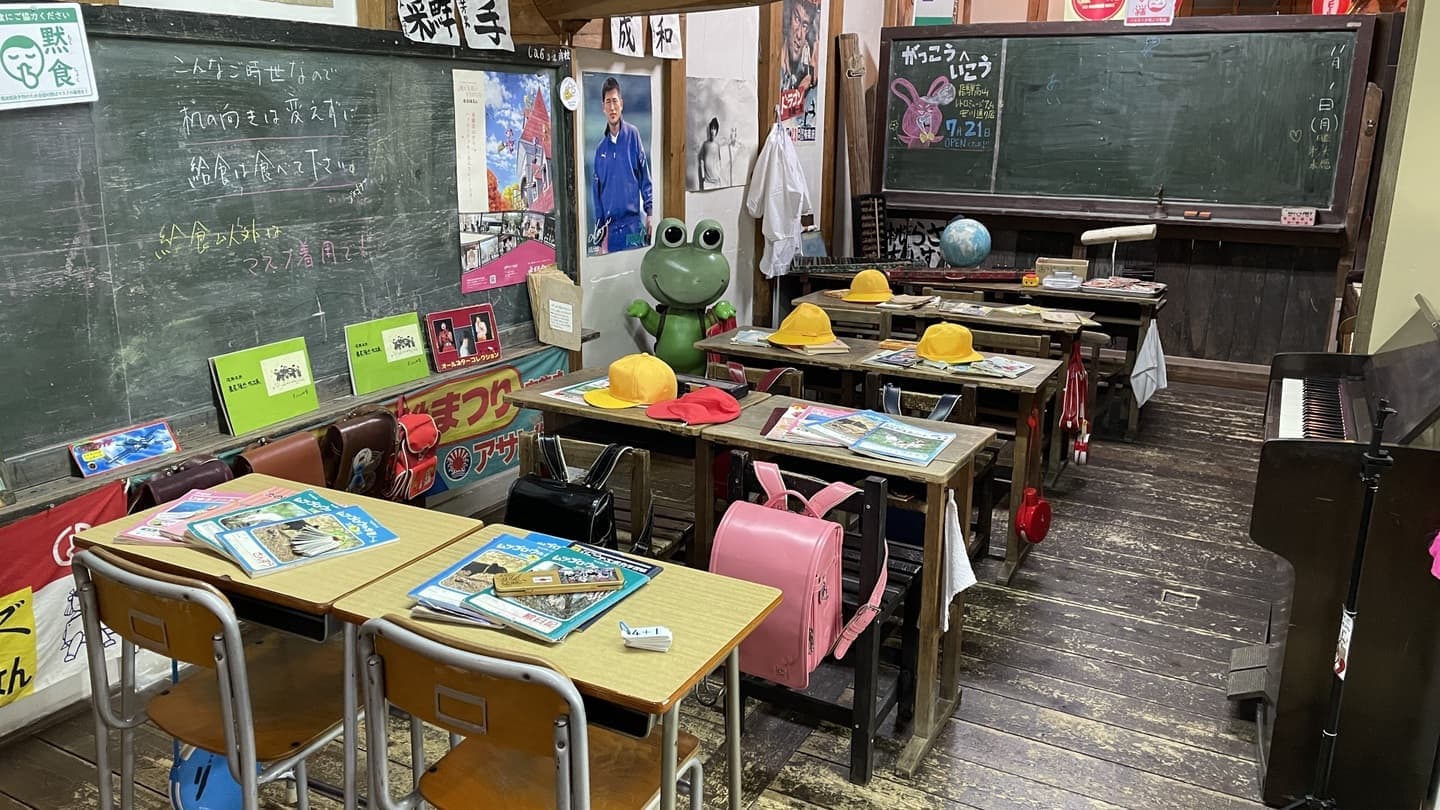 館内の小学校ブースでは木製の小学校の机や椅子に座り、昭和の時代に食べた学校給食が体験できます。懐かしいソフト麺、あげパン、ミルメークなどがセットになった学校給食を体験してみませんか?