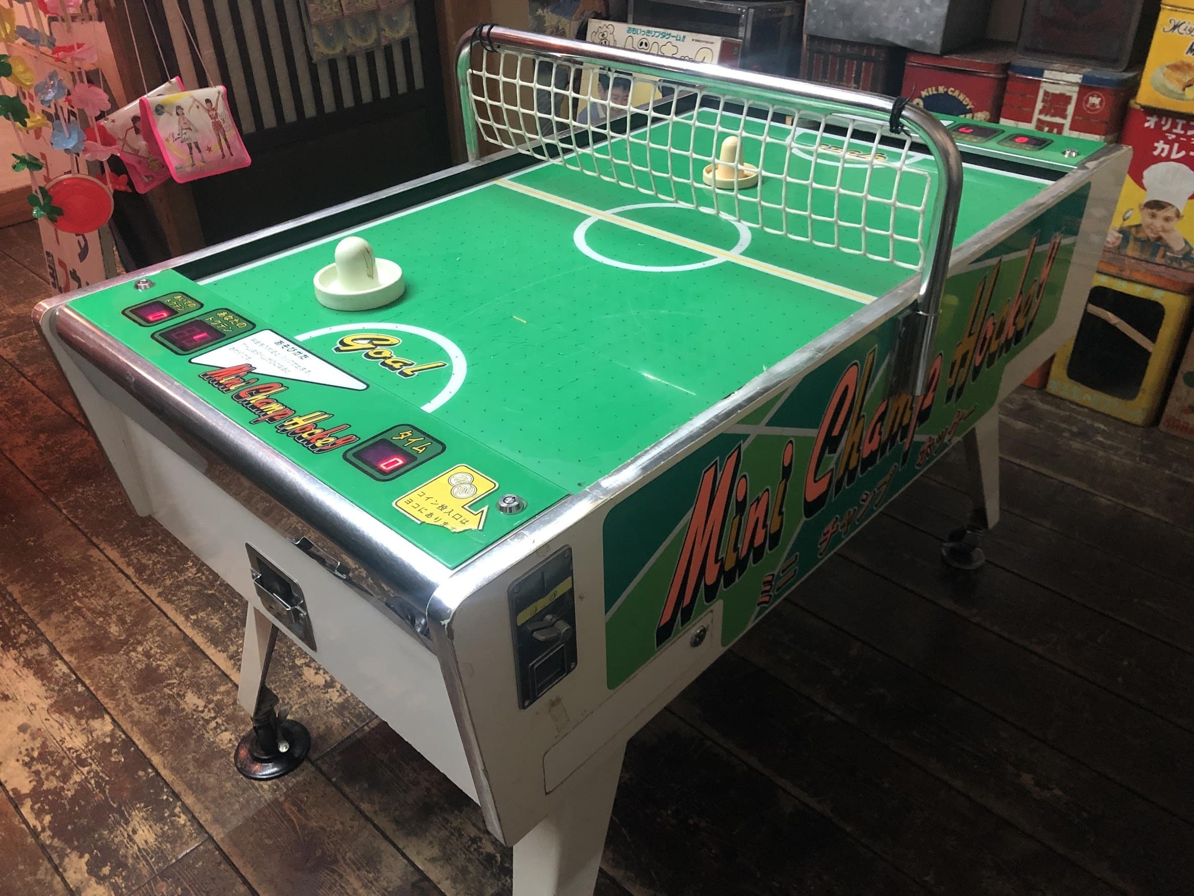 Old air hockey. If you put 100 yen, a round disk-shaped sphere will appear, so you can play it by putting it in a goal like soccer. Which will win in 60 seconds!